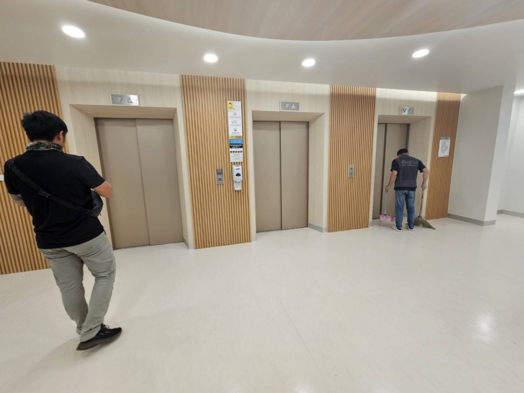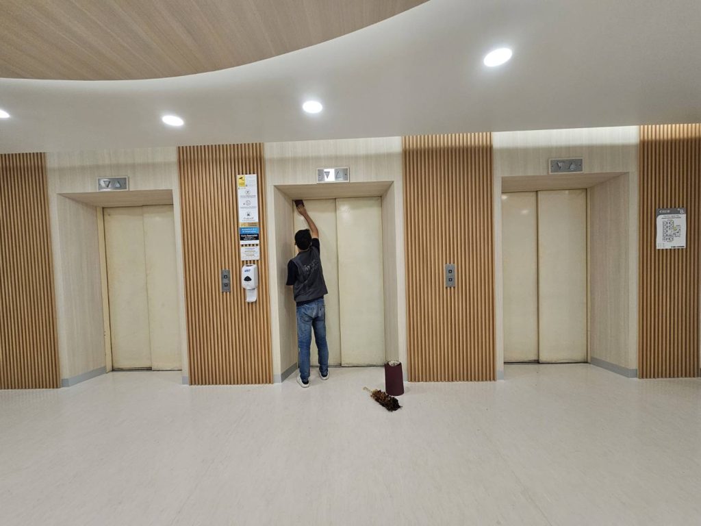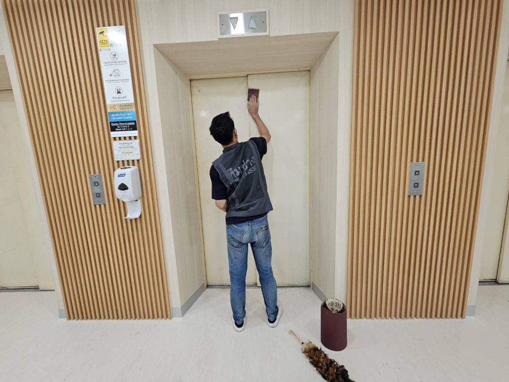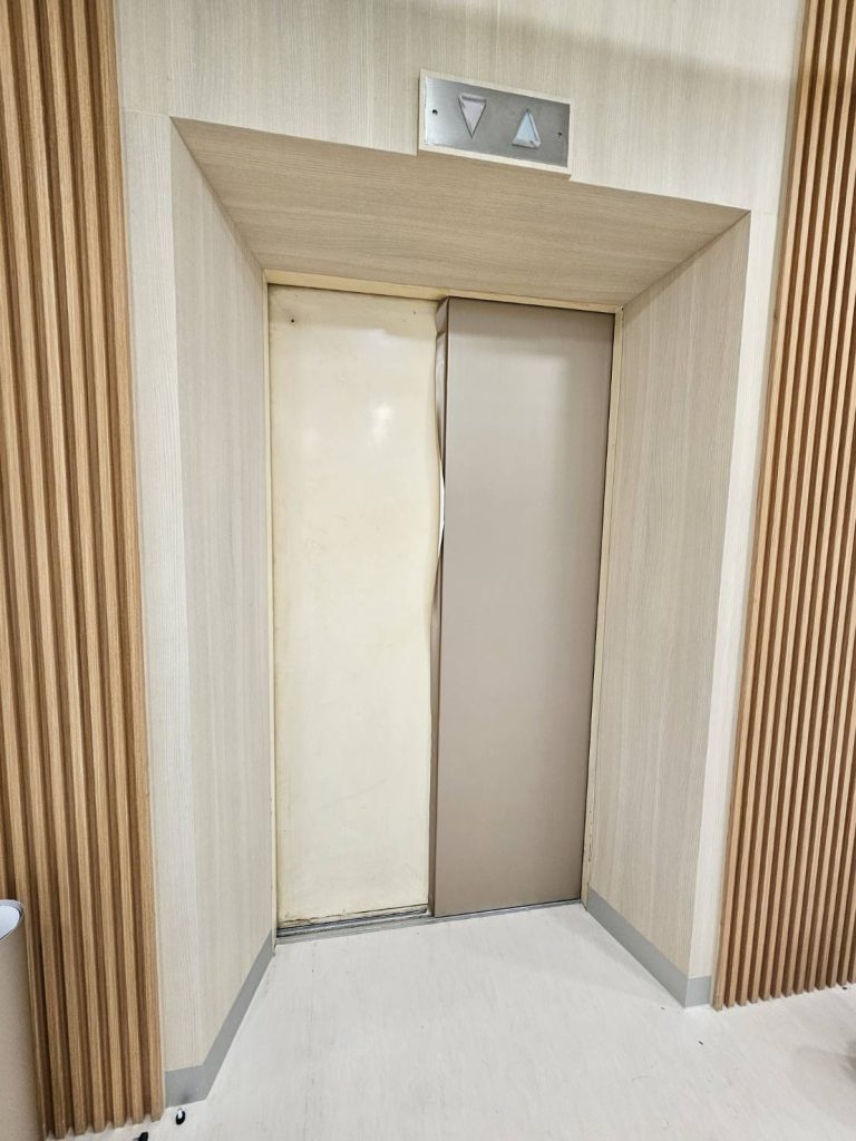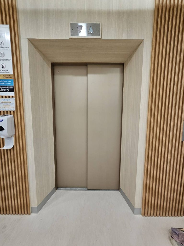 ปิดผิวเฟอร์นิเจอร์ภายในโรงพยาบาลศรีนครสวรรค์ ด้วยฟิล์มสีทองเนื้อเรียบลายโลหะรหัส PMS327 บริเวณประตูลิฟต์ผู้โดยสาร
