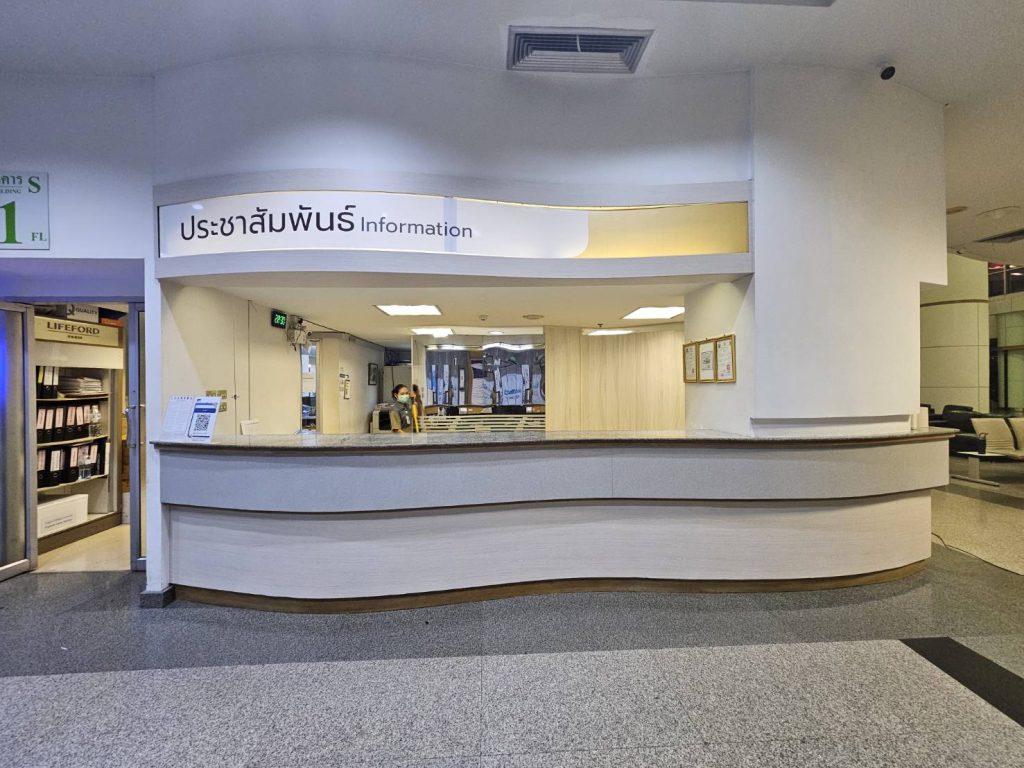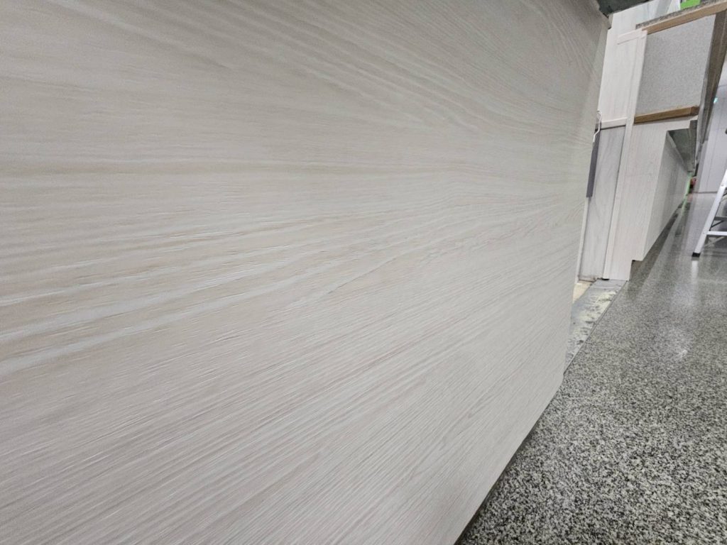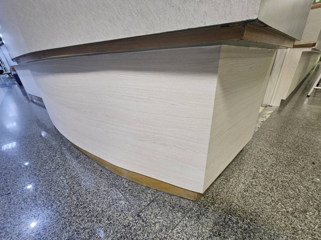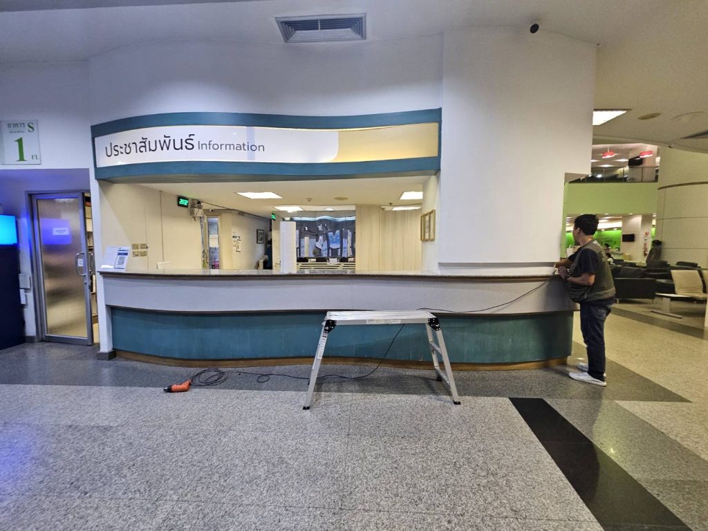 ปิดผิวเคาท์เตอร์ให้บริการของทางโรงพยาบาลด้วยฟิล์มลายไม้ รหัส PW956 ยาวตลอดแนวเคาท์เตอร์โดยไม่ต้องมีรอยต่อ บนผิวไม้เอ็มดีเอฟกันชื้น