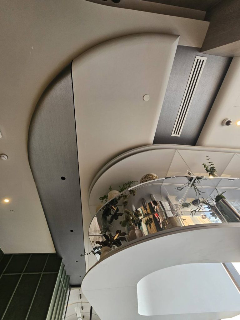 งานปิดผิวฝ้าเพดานโครงการคอนโด Nue Riverest Ratburana ริมแม่น้ำเจ้าพระยา กรุงเทพฯ ด้วยฟิล์มปิดผิวเฟอร์นิเจอร์แบรนด์ยองลิม รหัส PME315 ลายเมทัลลิกสีเทา Hirline
